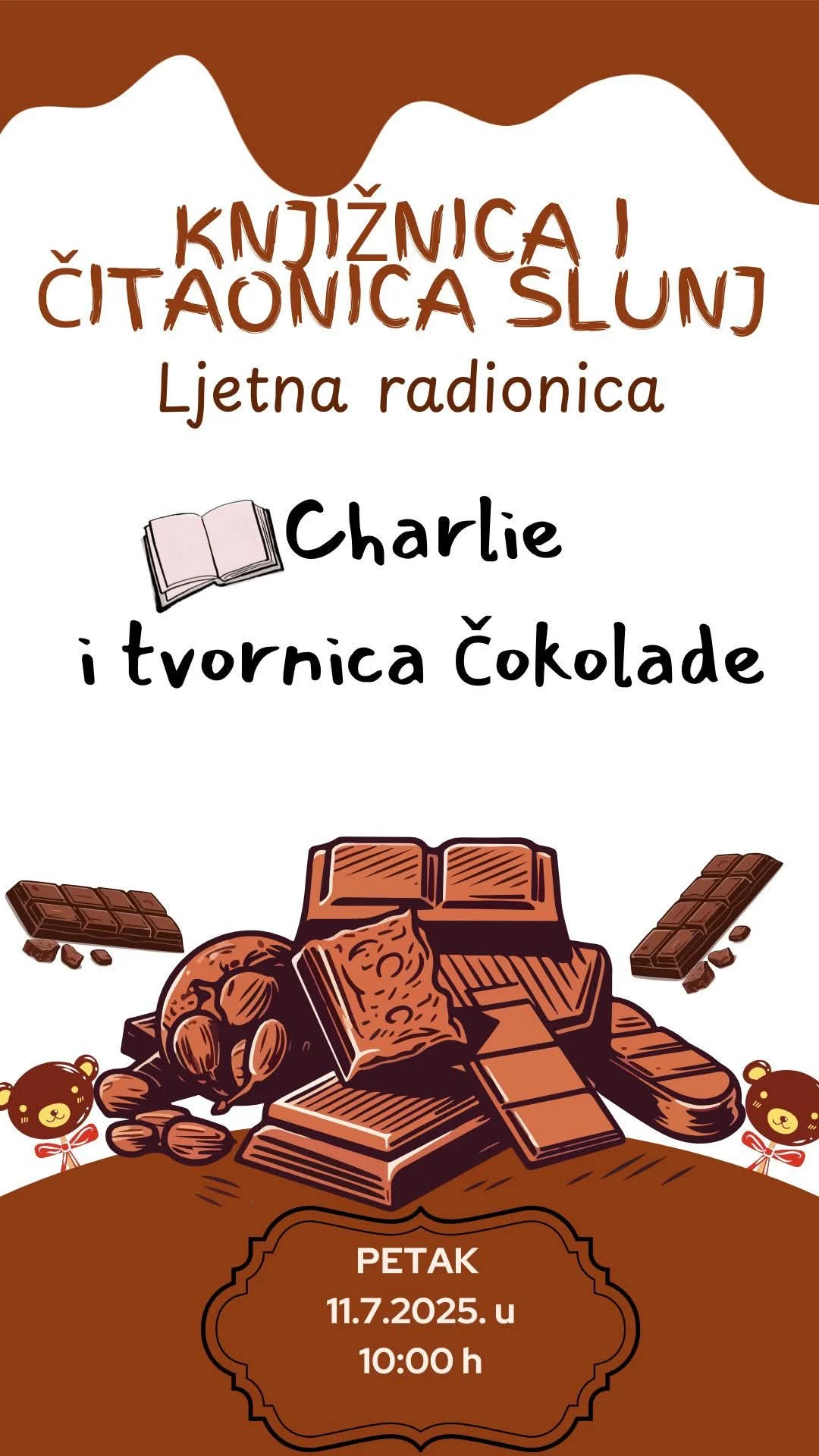 U petak, 11. srpnja 2025., u Knjižnici i čitaonici Slunj održana je vesela i slatka radionica inspirirana knjigom “Charlie i tvornica čokolade” Roalda Dahla! 🏭📚