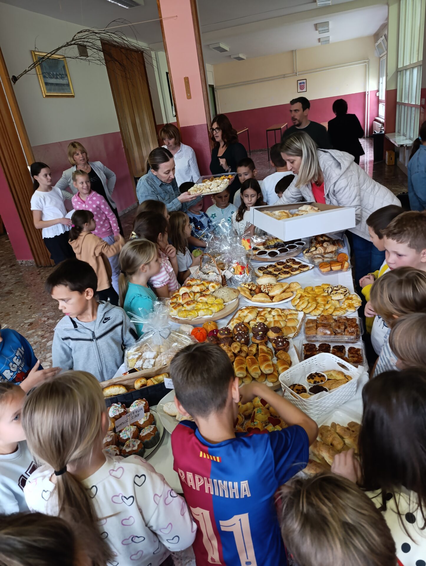 U školskom holu izloženi su brojni pekarski proizvodi koje su s puno mašte i truda pripremila djeca i njihovi roditelji, stvarajući bogat i mirisan izložbeni stol pun peciva, kruhova i kolača.