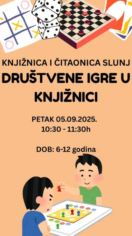 unj vas poziva na Dan društvenih igara u knjižnici u petak, 5.9.2025. od 10:30 satiNapisao: Radio Slunj