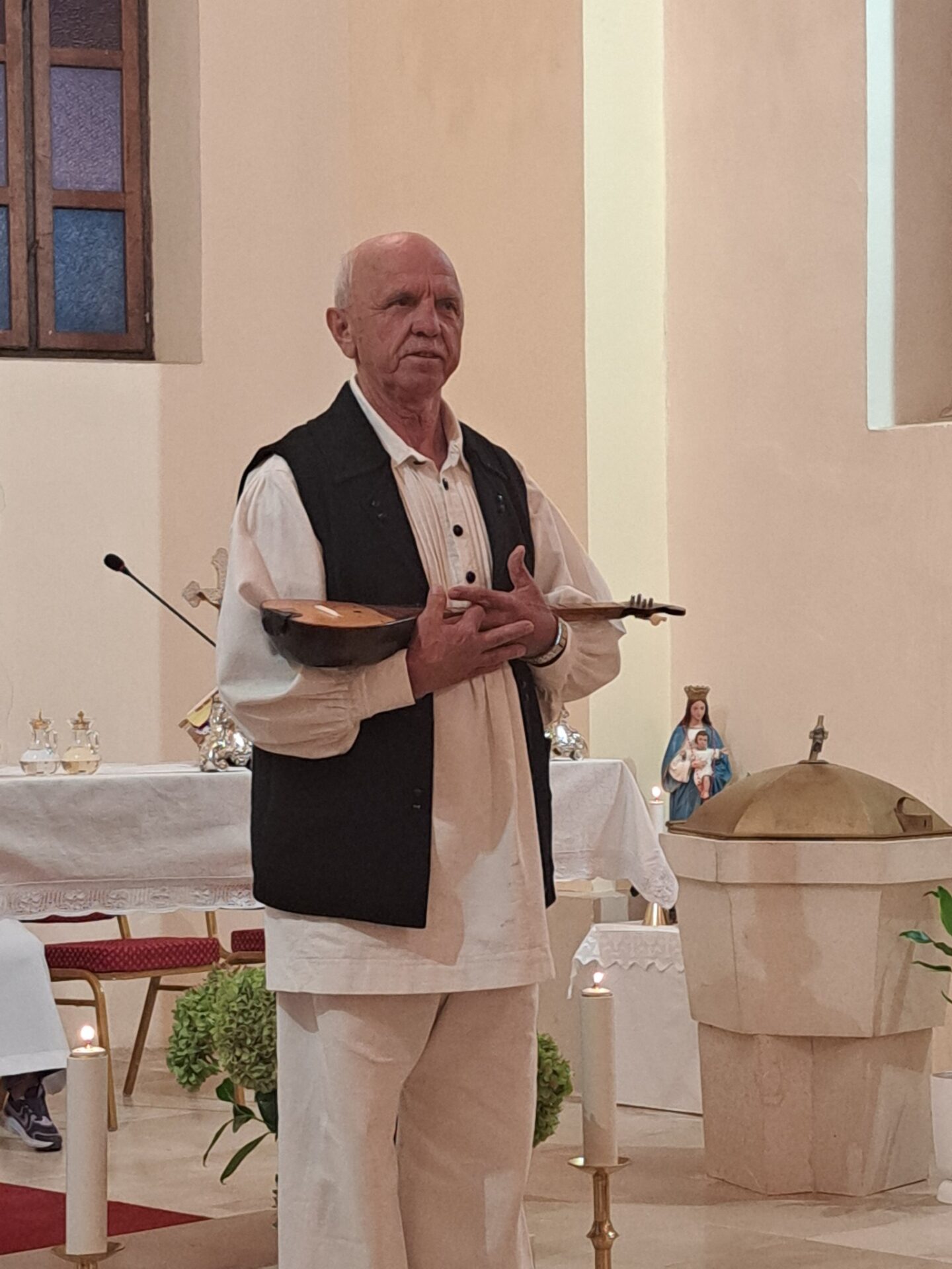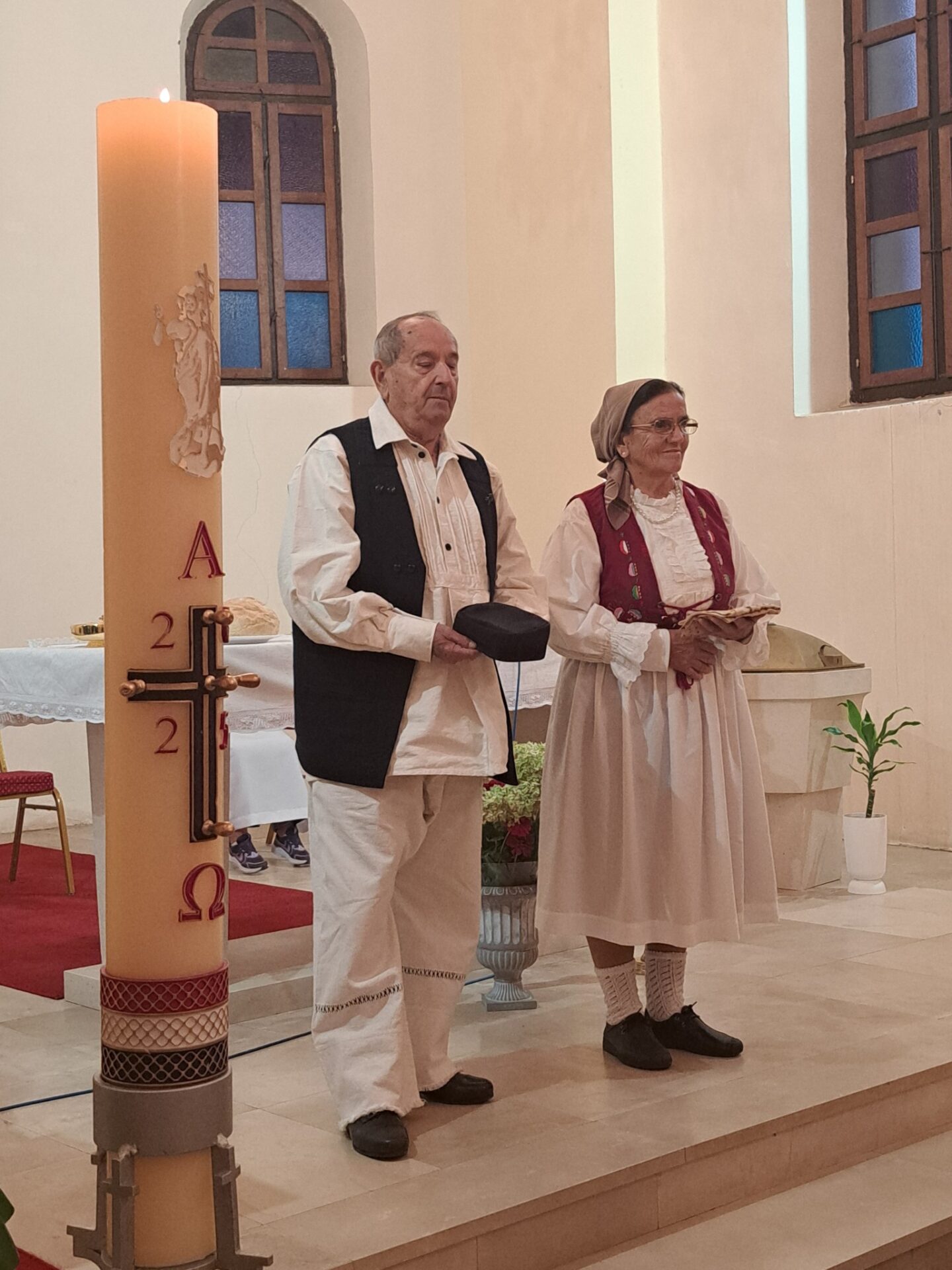 Članovi KUD-a sudjelovali su u misnom slavlju s prinosom darova – kruha, vode i vina, kape i rubca, čemera i tamburice samice – simbola tradicije, zajedništva i narodnog stvaralaštva.
