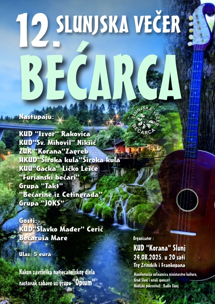Ove nedjelje 24. kolovoza 2025. s početkom u 20h, 12. Slunjska večer bećarca.